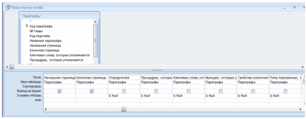 Запит «Поиск пустых полей» виконує пошук параграфів, в яких немає інформації про: определения, ключевые слова, функции, свойства компонентов, типы переменных.