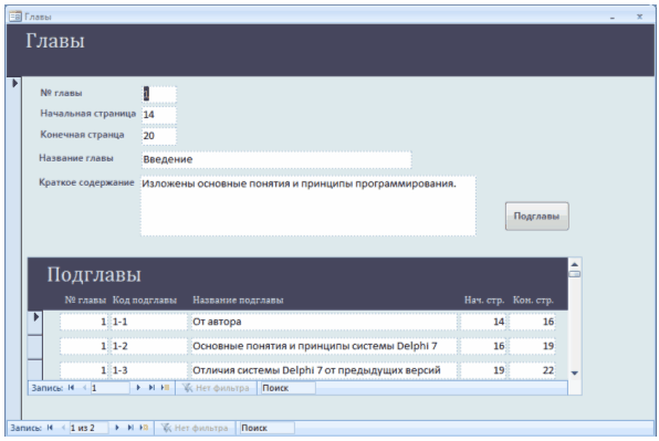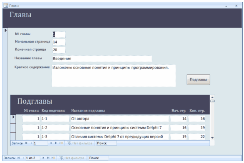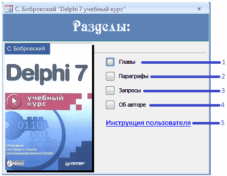 У цій базі даних зберігається довідкова інформація, що міститься у певних главах посібника з прикладного програмування (Бобровский С.И. Delphi 7. Учебный). База містить запити, що дозволяють здійснювати пошук необхідних даних та відображати статистичну інформацію, як то: інформацію про те, які глави які підглави містять, та про початкову й кінцеву сторінки цих підглав; відомості про присутність у тій чи іншій главі рисунків; відображення зазначеного користувачем фрагменту коду та типу змінних; вивід результату розрахунку загальної кількості сторінок у підглавах; пошук пустих полів.
