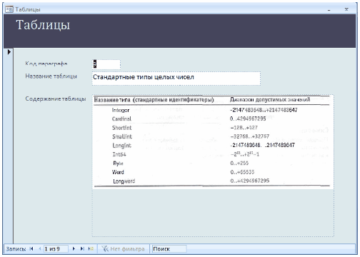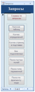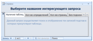 Існує кілька типів запитів: на вибірку, на оновлення, на додавання, на видалення, перехресний запит, створення таблиць. Найбільш поширеним є запит на вибірку. Запити на вибірку використовуються для відбору потрібної користувачу інформації, що міститься в таблицях. Вони створюються тільки для пов'язаних таблиць [9]. Запит «Наличие таблиц» виводить інформацію про параграфи у яких присутні таблиці.