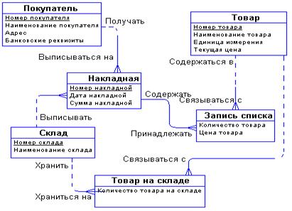 Куди помістити суть "Накладна" і "Склад" і з чим їх зв'язати? Запитаємо себе, яка зв'язана ця суть між собою і з суттю "Покупець" і "Товар"? Покупці купують товари, отримуючи при цьому накладні, до яких внесені дані про кількість і ціну купленого товару. Кожен покупець може отримати декілька накладних. Кожна накладна зобов'язана виписуватися на одного покупця. Кожна накладна зобов'язана містити декілька товарів (не буває порожніх накладних). Кожен товар, у свою чергу, може бути проданий декільком покупцям через декілька накладних. Крім того, кожна накладна повинна бути виписана з певного складу, і з будь-якого складу може бути виписано багато накладних. Таким чином, після уточнення, діаграма виглядатиме таким чином:
