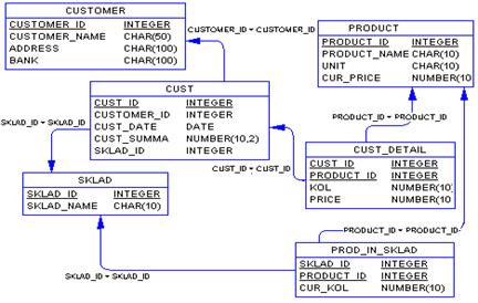 На даній діаграмі кожна суть є таблицею бази даних, кожен атрибут стає колонкою відповідної таблиці. Звертаємо увагу на те, що в багатьох таблицях, наприклад, "CUST_DETAIL" і "PROD_IN_SKLAD", відповідних суті "Запис списку накладної" і "Товар на складі", з'явилися нові атрибути, яких не було в концептуальній моделі, - це ключові атрибути батьківських таблиць, що мігрували в дочірні таблиці для того, щоб забезпечити зв'язок між таблицями за допомогою зовнішніх ключів.