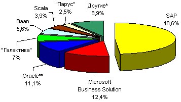 Доли ведущих поставщиков ERP-систем в России.