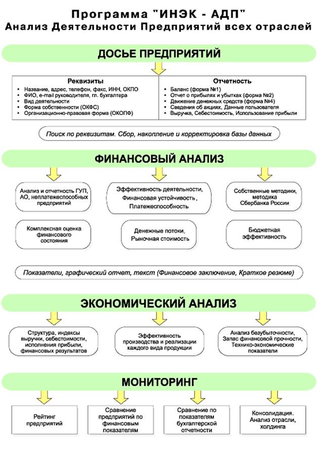 Программа "ИНЭК-АДП" предназначена для проведения анализа (на основе данных бухгалтерской и управленческой отчетности) финансово-экономической деятельности предприятий и организаций всех видов деятельности (Приложение 2). Данная программа, включая в себя все возможности "ИНЭК-АФСП", дополнительно позволяет: