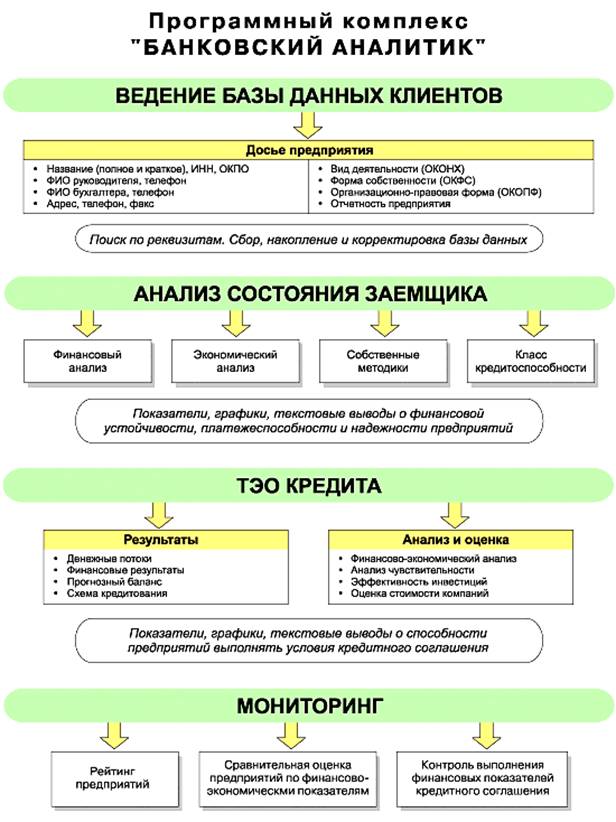 · Программный комплекс "Банковский Аналитик" - предназначен для финансового анализа заемщика, расчета резервов по ссудам, оценки стоимости бизнеса, расчета стоимости чистых активов, анализа ТЭО кредита, план-фактного контроля;