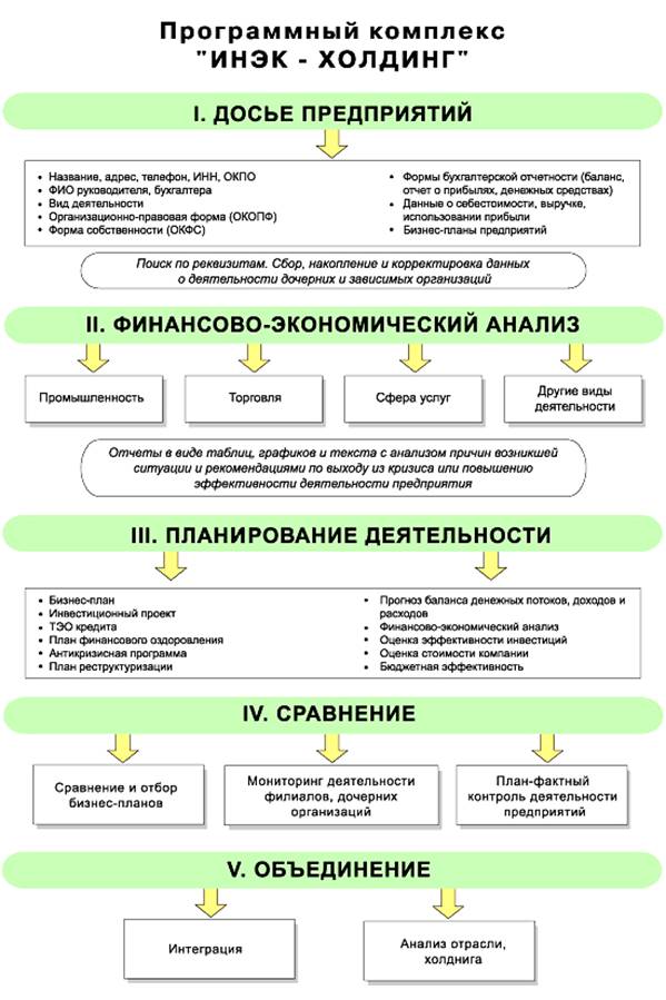 · Программный комплекс "ИНЭК-Холдинг" – предназначен для финансово-экономического анализа, мониторинга, сравнения, планирования и план-фактного контроля предприятий и организаций любых видов деятельности (производство, предоставление услуг, торговля и пр.).