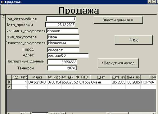 'DoCmd.RunSQL "INSERT INTO Продажа (Код_автомобиля,Дата_продажи,Фамилия_покупателя,Имя_покупателя,Отчество_покупателя,Город,Адрес,Паспортные_данные,Телефон) VALUES (Val(" + Код_автомобиля + "),CDate(" + Дата_продажи + ")," + Фамилия_покупателя + "," + Имя_покупателя + "," + Отчество_покупателя + "," + Город + "," + Адрес + ",Val(" + Паспортные_данные + "),Val(" + Телефон + "))"