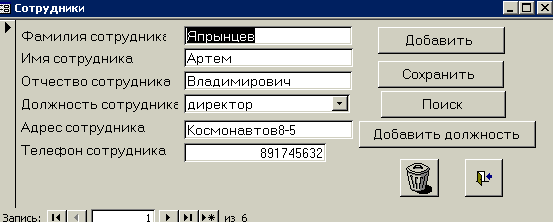 И наконец таблица «Сотрудники» имеет следующие поля и соответствующие им типы данных представленных в таблице 4.