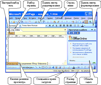 После запуска программы FrontPage (Пуск – программы – FrontPage) на экране появится окно программы, в котором отображается новая страница (нов_стр_1.htm). В области задач отображается панель Приступая к работе.