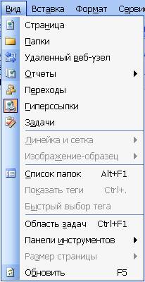 Команды, которые предназначены для работы с Web–страницами и Web–узлами, расположены в меню Вид программы FrontPage: