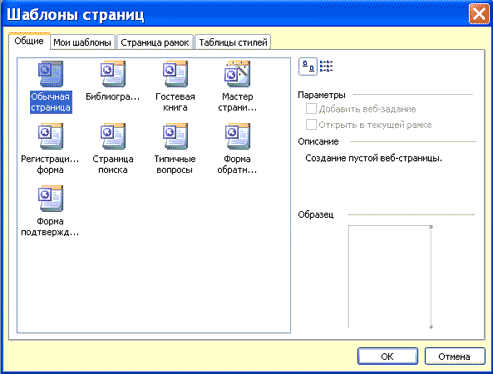 Создать новую страницу можно также на базе одного из шаблонов. Для этого необходимо выбрать команду «Другие шаблоны страниц» в области задач. На экране будет отображаться окно диалога Шаблоны страниц, в котором представлены различные шаблоны страниц по категориям.