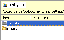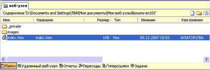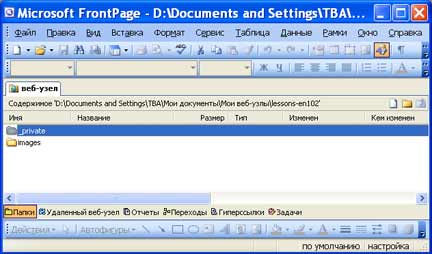 После сохранения сайта на экране в окне приложения FrontPage будет отображаться новый веб-узел в режиме папки.
