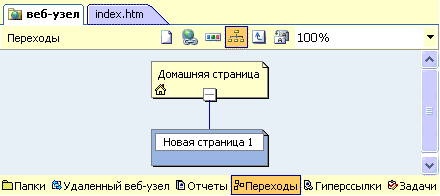 Далее можно осуществить разработку домашней страницы (создать разметку или структуру страницы, ввести текст, рисунки и т.д.), а затем к домашней странице можно добавить страницы в режиме Переходы. Для этого в режиме Переходы выделите домашнюю страницу и щелкните на кнопке Новая страница на панели Переходы или примените контекстное меню. Будет добавлена Новая страница 1, которая представлена на рисунке. Далее добавьте столько страниц, сколько необходимо для сайта, затем страницы можно переименовать и изменить порядок их следования. Далее на каждую страницу нужно ввести содержание или контент (текст, таблицы, картинки и т.д.), в результате получим сайт.
