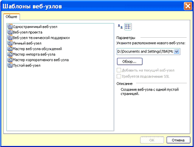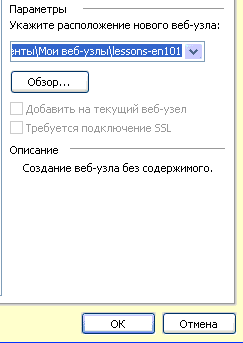 Затем выполняем команду Файл / Создать и в отрывшейся области задач «Создание» щелкаем мышью на «Другие шаблоны веб – узлов» в разделе «Создать Веб-узел». Откроется окно диалога «Шаблоны веб – узлов», в котором необходимо выделить «Пустой веб – узел», далее указать расположение нового веб-узла (например, D:\Documents and Settings\ТВА\Мои документы\Мои веб-узлы\lessons-en101) и щелкнуть ОК. На рисунке представлен фрагмент окна диалога «Шаблоны веб – узлов», в котором указан адрес нового сайта.