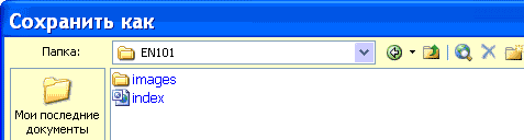 В окне приложения появится новая пустая страница. Сохраняем страницу, но перед тем, как сохранить страницу в окне «Сохранить» создаем папку, например EN101, в которой создаем вложенную папку images для рисунков, а затем сохраняем страницу в папке EN101. Имя страницы назначаем - index, что означает домашняя или главная страница. Редактор сохраняет страницу с расширением .htm. Таким образом, в папке EN101, будет находиться вложенная папка images и файл index.htm.