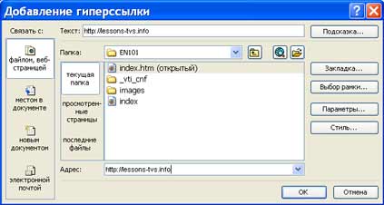 и создаем гиперссылки. Например, выделяем адрес http://lessons-tva.info и вызываем контекстное меню, в котором выбираем команду Гиперссылка. В открывшемся окне диалога в строке Текст выделяем http://lessons-tva.info и копируем (Ctrl+C), затем установить курсор в строку Адрес и вставить из буфера обмена (Ctrl+V), щелкнуть ОК.