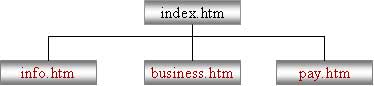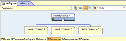 5. Создаем в редакторе FrontPage структуру сайта , т.е. к главной странице добавим еще три страницы: info - О компании; business - Бизнес-обзор проекта; pay - Способы оплаты. Для этого надо перейти в режим Переходы, выполнив команду Вид/Переходы. Затем необходимо выделить домашнюю страницу и щелкнуть на кнопке Новая страница на панели Переходы или применить контекстное меню, добавится Новая страница 1. Аналогичным образом добавляем еще две новые страницы. Структура сайта представлена на рисунке.