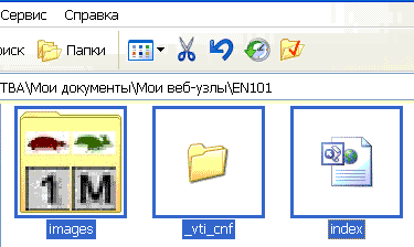 3. Затем копируем содержимое ранее созданной папки EN101, в которой находятся папка images и страничка index (папка _vti_cnf формируется автоматически при создании веб-страницы). Содержимое папки EN101 представлено на рисунке.