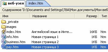 7. С целью единства дизайна страниц сайта копируем содержание главной страницы в созданные страницы info, business, pay. Для этого открываем главную страницу в режиме Страница и выполняем команду "Правка / Выделить все", и щелкаем на кнопке Копировать на панели инструментов. Переходим в режим Папки и щелкаем дважды на страничке info, она откроется в режиме Страница, затем щелкаем на кнопке Вставить. Содержимое главной страницы скопируется в страницу info, аналогично копируем содержимое главной страницы в остальные две страницы.