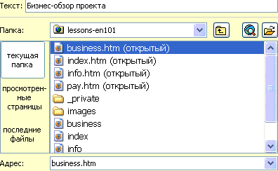 Например, выделяем пункт навигации "Бизнес-обзор проекта" и с помощью контекстного меню открываем окно диалога Добавления гиперссылки, в котором выделяем business.htm и щелкаем ОК. Аналогично создаем гиперссылки для всех пунктов навигации на всех страницах. На рисунке представлен фрагмент окна диалога Добавления гиперссылки.