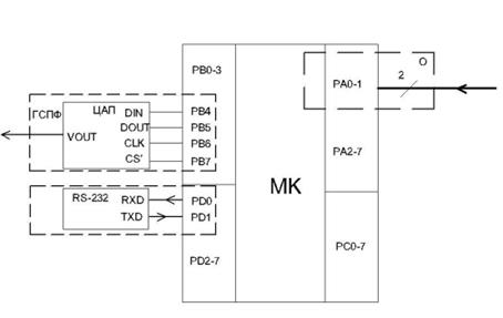 Для реалізації генератора сигналів довільної форми використається блок цифро-аналогового перетворювача, побудованого на ИМС DA3 типи TLC5615 фірми Texas Instruments, що представляє собою десятирозрядний ЦАП з послідовним SPI- інтерфейсом, виведеним на порт «B» контролера. Таким чином, використаються розряди 4-7 порту В. Фільтр вихідного сигналу першого порядку організується за допомогою модуля блоку вихідних ключів, до складу якого входять 2 RC фільтри НЧ для фільтрації вихідних сигналів мікроконтролера. Вони підключаються до виходів 4-5 порту С.