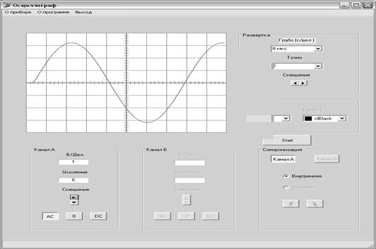 При виборі з головного вікна ВВК приладу «осцилограф» з'являється наступне вікно, що відображає елементи керування роботою приладу: