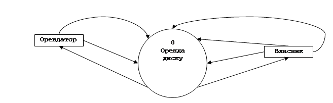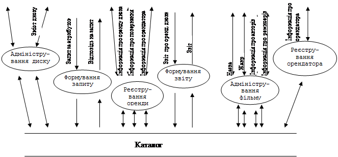 На підставі обстеження функціонування фільмотеки проведемо аналіз за методологією нотації Йордана у вигляді ієрархій діаграм. Представимо всю інформацію у графічному виді за допомогою діаграм DFD. Спочатку розробимо діаграму 0 рівня (рис. 1). Тут представлено взаємодію зовнішніх сутностей для вирішення поставленої задачі..