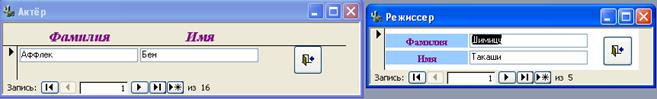 c) Було введено до бази даних нових акторів та режисерів, шляхом натиснення кнопок «Добавить актёра», «Добавить режиссера» та заповнення полів «Имя» та «Фамилия». Всі дані були успішно додані до таблиць «Актёр» та «Режиссер».