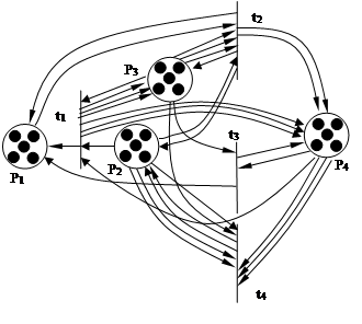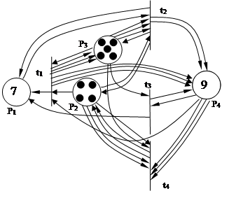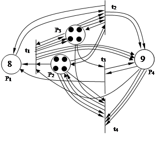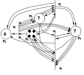 7. Мережа Петрі складається з чотирьох елементів: скінченної множини позицій Р = {p 1, p 2,..., pn }, множини переходів Т = {t 1, t 2,..., tm }, вхідної функції І :T →P , і вихідної функції О :T →P .