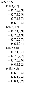 #include <vcl.h> #include <string.h> #pragma hdrstop #include "Unit1.h" #include "Unit2.h" #include "Unit3.h" //-------------------------------------------------------------------------- #pragma package(smart_init) #pragma link "XPManifest" #pragma link "acButtons" #pragma resource "*.dfm" #define n 4 TForm1 *Form1; //--------------------------------------------------------------------------- struct TMT { int z; int p[n]; int t[n]; }; TMT P[n], T[n]; int ccc[n],cc[n],c[n],b; //--------------------------------------------------------------------------- __fastcall TForm1::TForm1(TComponent* Owner) : TForm(Owner) { } //--------------------------------------------------------------------------- void run() { P[0].z=StrToInt(Form1->StringGrid3->Cells[1][0]); T[0].z=0; ccc[0]=P[0].z; P[1].z=StrToInt(Form1->StringGrid3->Cells[2][0]); T[1].z=0; ccc[1]=P[1].z; P[2].z=StrToInt(Form1->StringGrid3->Cells[3][0]); T[2].z=0; ccc[2]=P[2].z; P[3].z=StrToInt(Form1->StringGrid3->Cells[4][0]); T[3].z=0; ccc[3]=P[3].z; int z; for(z=0; z<n; z++) { for(int i=0; i<n; i++) {P[z].t[i]=0; T[i].p[z]=0; for(int j=0; j<Form1->StringGrid1->ColCount; j++) { if((StrToIntDef(Form1->StringGrid2->Cells[j][i],0))) if(z+1==StrToInt(Form1->StringGrid2->Cells[j][i]))P[z].t[i]++; if((StrToIntDef(Form1->StringGrid1->Cells[j][i],0))) if(z+1==StrToInt(Form1->StringGrid1->Cells[j][i]))T[i].p[z]++; }}}} //--------------------------------------------------------------------------- void search() { AnsiString p,p2,t,t2; int z,j,zz; for(z=0; z<Form1->StringGrid1->RowCount; z++) { p="I(p"+IntToStr(z+1)+")={"; t="O(p"+IntToStr(z+1)+")={"; for(j=0; j<Form1->StringGrid2->RowCount; j++) for(zz=0; zz<Form1->StringGrid2->ColCount; zz++) { if((StrToIntDef(Form1->StringGrid2->Cells[zz][j],0))) if(z+1==StrToInt(Form1->StringGrid2->Cells[zz][j])) { p2="t"+IntToStr(j+1)+","; p+=p2; } if((StrToIntDef(Form1->StringGrid1->Cells[zz][j],0))) if(z+1==StrToInt(Form1->StringGrid1->Cells[zz][j])) { t2="t"+IntToStr(j+1)+","; t+=t2; } } if(p.Pos("t")) p[p.Length()]='}';else p+="}"; Form1->Memo1->Lines->Add(p); if(t.Pos("t")) t[t.Length()]='}';else t+="}"; Form1->Memo2->Lines->Add(t); }} //========================================================= void __fastcall TForm1::FormCreate(TObject *Sender) { for(int i=0; i<Form1->StringGrid1->RowCount; i++) { StringGrid1->Cells[0][i]="I(t"+IntToStr(i+1)+")"; StringGrid2->Cells[0][i]="O(t"+IntToStr(i+1)+")"; } StringGrid3->Cells[0][0]=" м"; StringGrid3->Cells[1][0]="5"; StringGrid3->Cells[2][0]="5"; StringGrid3->Cells[3][0]="5"; StringGrid3->Cells[4][0]="5"; } //========================================================= void spp(int i) { for(int j=0; j<n; j++) if(T[i].p[j]&&T[i].p[j]>P[j].z) {b=0; break;} if(b==1) { for(int j=0; j<n; j++) { T[i].z+=T[i].p[j]; P[j].z-=T[i].p[j]; } for(int k=0; k<n; k++) if(P[k].t[i]!=0&&T[i].z!=0) P[k].z+=P[k].t[i]; } } void kpk() { for(int i=0; i<n; i++) { Form1->TreeView1->Items->AddChild(Form1->TreeView1->Items->Item[0],"0"); Form2->TreeView1->Items->AddChild(Form2->TreeView1->Items->Item[0],"0"); for(int j=0; j<n; j++) { Form1->TreeView1->Items->AddChild(Form1->TreeView1->Items->Item[0]->Item[i],"0"); Form2->TreeView1->Items->AddChild(Form2->TreeView1->Items->Item[0]->Item[i],"0"); for(int e=0; e<n; e++) { Form1->TreeView1->Items->AddChild(Form1->TreeView1->Items->Item[0]->Item[i]->Item[j],"0"); Form2->TreeView1->Items->AddChild(Form2->TreeView1->Items->Item[0]->Item[i]->Item[j],"0"); }}}}//--------------- //======================================= int p1,p2,p3; void run_5() p1=-1; AnsiString f="m("+IntToStr(P[0].z)+","+IntToStr(P[1].z)+","+IntToStr(P[2].z)+","+IntToStr(P[3].z)+")"; Form1->TreeView1->Items->Clear(); Form2->TreeView1->Items->Clear(); Form1->TreeView1->Items->Add(NULL,f); Form2->TreeView1->Items->Add(NULL,f); Form1->TreeView1->Items->Item[0]->Text=f; Form2->TreeView1->Items->Item[0]->Text=f; kpk(); for(int i=n-1; i>-1; i--) {b=1; T[i].z=0; p1++; p2=-1; if(!Form1->CheckBox2->Checked) t1=p1; else t1=i; P[0].z=ccc[0]; P[1].z=ccc[1]; P[2].z=ccc[2]; P[3].z=ccc[3]; spp(p1); AnsiString f="t"+IntToStr(p1+1)+"("+IntToStr(P[0].z)+","+IntToStr(P[1].z)+","+IntToStr(P[2].z)+","+IntToStr(P[3].z)+")"; if(ccc[0]!=P[0].z||ccc[1]!=P[1].z||ccc[2]!=P[2].z||ccc[3]!=P[3].z) { Form1->TreeView1->Items->Item[0]->Item[t1]->Text=f; Form2->TreeView1->Items->Item[0]->Item[t1]->Text=f; cc[0]=P[0].z; cc[1]=P[1].z; cc[2]=P[2].z; cc[3]=P[3].z; } else goto end; for(int j=n-1; j>-1; j--) {b=1; T[j].z=0; p2++; p3=-1; if(!Form1->CheckBox2->Checked) t2=p2; else t2=j; P[0].z=cc[0]; P[1].z=cc[1]; P[2].z=cc[2]; P[3].z=cc[3]; spp(p2); AnsiString f="t"+IntToStr(p2+1)+"("+IntToStr(P[0].z)+","+IntToStr(P[1].z)+","+IntToStr(P[2].z)+","+IntToStr(P[3].z)+")"; if(cc[0]!=P[0].z||cc[1]!=P[1].z||cc[2]!=P[2].z||cc[3]!=P[3].z) { Form1->TreeView1->Items->Item[0]->Item[t1]->Item[t2]->Text=f; Form2->TreeView1->Items->Item[0]->Item[t1]->Item[t2]->Text=f; c[0]=P[0].z; c[1]=P[1].z; c[2]=P[2].z; c[3]=P[3].z; } else goto end1; for(int e=n-1; e>-1; e--) { b=1; T[j].z=0; p3++; if(!Form1->CheckBox2->Checked) t3=p3; else t3=e; P[0].z=c[0]; P[1].z=c[1]; P[2].z=c[2]; P[3].z=c[3]; spp(p3); AnsiString f="t"+IntToStr(p3+1)+"("+IntToStr(P[0].z)+","+IntToStr(P[1].z)+","+IntToStr(P[2].z)+","+IntToStr(P[3].z)+")"; if(c[0]!=P[0].z||c[1]!=P[1].z||c[2]!=P[2].z||c[3]!=P[3].z) { Form1->TreeView1->Items->Item[0]->Item[t1]->Item[t2]->Item[t3]->Text=f; Form2->TreeView1->Items->Item[0]->Item[t1]->Item[t2]->Item[t3]->Text=f; } } end1: }end: } void __fastcall TForm1::acBitBtn2Click(TObject *Sender) { int i=0,j=0; p1=n; b=1; p1=n; Memo1->Clear(); Memo2->Clear(); search(); run(); run_5(); } |