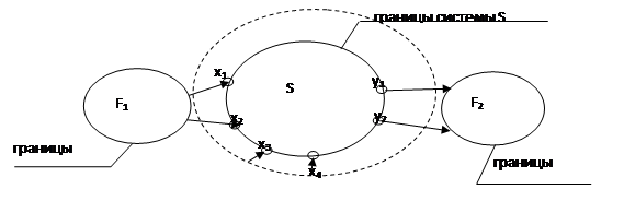 Система, как правило, взаимодействует с другими системами (Fi , i=1,2,…), которые для нее являются внешней средой, связь осуществляется между некоторыми (или всеми) элементами, принадлежащими данной системе, и элементами других систем (см. рис. 1.1). Другие системы – это внешняя среда для системы S. Если взаимодействие системы S с внешней средой не рассматривается (в теоретических исследованиях, например), тогда система называется закрытой или автономной. Множество переменных (координат), через которые система S взаимодействует с внешней средой, часто разделяют на подмножества входных X={xi , i=1,2…} и выходных Y={yj ; j=1,2…} координат системы. В реальном мире один и тот же элемент может входить в разные системы. Взаимодействие систем носит разноплановый характер, поэтому существенным вопросом является определение границ системы и выделение переменных Х,Y. Причем значение имеют, только связи, определяющие интегративное качество, т.е. «имидж» системы.