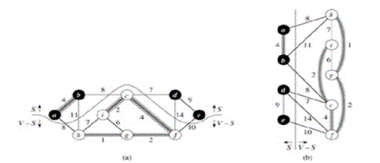 (Ь) Вершины множества S изображены слева, вершины V \ S — справа. Ребро пересекает разрез, если оно пересекает вертикальную прямую.