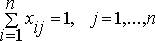 Введем переменную xij значение которой равно 1, если выполнение j-ой работы поручено i-му работнику, и равно 0, в противном случае. Тогда, поскольку на работе j может быть задействован только один работник, то справедливо равенство: