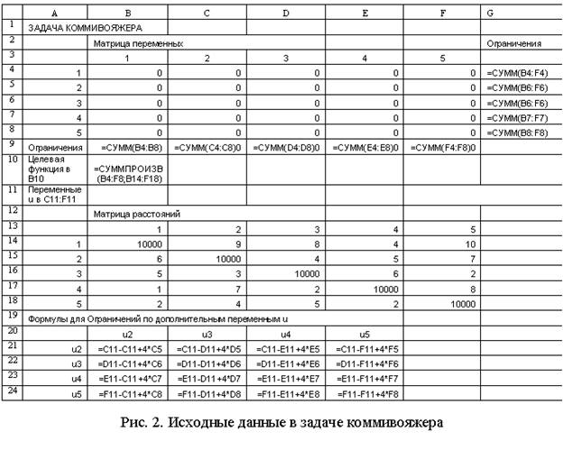 Исходные данные в рабочей книге Excel приведены на рис. 2. Здесь же приведены формулы для вычисления ограничений и целевой функции.