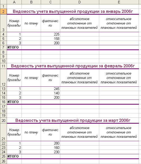 4. На рабочем листе Факт MSExcelсоздаем таблицы фактических данных выпуска продукции по месяцам.