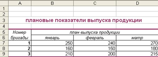Рис.5 Расположение таблицы плановые показатели выпуска продукции находящейся на листе планMSExcel.