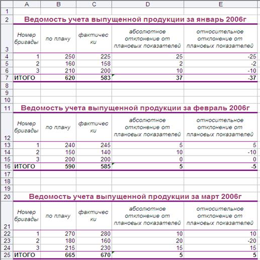 | Номер бригады | По плану | Фактически | Абсолютное отклонение от плановых показателей | Относительное отклонение от плановых показателей |