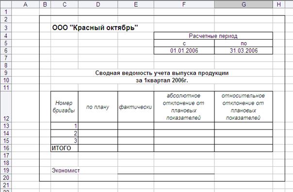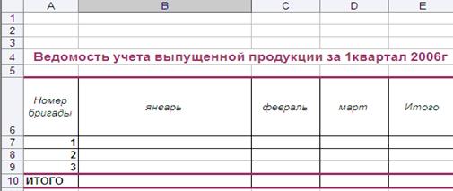 21. Создадим лист сводная ведомость , на котором создадим форму сводной ведомости по учету выпущенной продукции за квартал (рис.9).