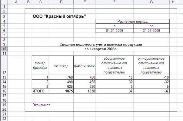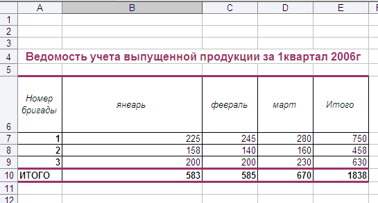 Рис.10 Заполненная форма сводной ведомости по учету выпущенной продукции за 1 квартал 2006