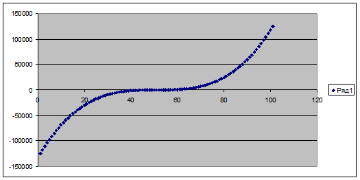 5. На другому листі потрібно побудувати графік таким способом: В комірку "А1" вписати значення "-50" і від значення "-50" потягнути за маркер заповнення лівою клавішею мишки до комірки "А101" включно. В комірці "B1" поставити знак = і помножити комірку "A1" три рази саму на себе(=A1*A1*A1) після натиснути клавішу "Enter".