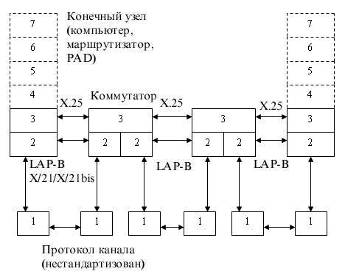 В 1976 году был принят стандарт X.25, который стал основой всемирной системы PSPDN (Packet-Switched Public Data Networks), базирующейся на 7-уровневой модели ISO OSI(Open System Interconnection). Стандарт X.25 был усовершенствован в 1984. Рекомендация Х.25 определяет интерфейс "пользователь-сеть" для сети PSPDN. Более точно: Х.25 определяет двухточечный, специализированный (выделенная линия), полнодуплексный интерфейс между пакетным терминальным оборудованием пользователя (Data Terminal Equipment, DTE) и оконечным оборудованием линии передачи данных (Data Circuit terminating Equipment, DCE) в сети PSPDN. Интерфейс Х.25 содержит три протокольных уровня, которые примерно соответствуют трем нижним уровням эталонной модели OSI. [1]