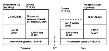 Канальный уровень реализуется протоколом LAP-F. Протокол LAP-F имеет два режима работы: основной и управляющий. В основном режиме кадры передаются без преобразования и контроля.[3-5]