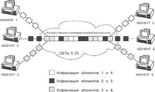 Метод разделения физического канала между абонентами в сетях X.25 называют еще мультиплексированием канала, точнее "логическим" или "статистическим" мультиплексированием, изображенные на рисунке 9. Термин "логическое" мультиплексирование" вводится, чтобы отличить этот метод от временного разделения канала, например. При временном разделении канала каждому из разделяющих его абонентов выделятся в рамках каждой секунды строго определенное количество миллисекунд для передачи его информации. При статистическом разделении канала нет строго регламентированной степени загрузки каждым из абонентов канала в каждый определенный момент времени. Эффективность использования статистического мультиплексирования зависит от статистических или вероятностных характеристик мультиплексируемого потока информации. Известно, что использование сети X.25 эффективно для широкого спектра задач передачи данных. Среди них и обмен сообщениями между пользователями, и обращение большого количества пользователей к удаленной базе данных, а также к удаленному хосту электронной почты, связь локальных сетей (при скоростях обмена не более 512 Кбит/с), объединение удаленных кассовых аппаратов и банкоматов. Другими словами, все приложения, в которых трафик в сети не является равномерным во времени.