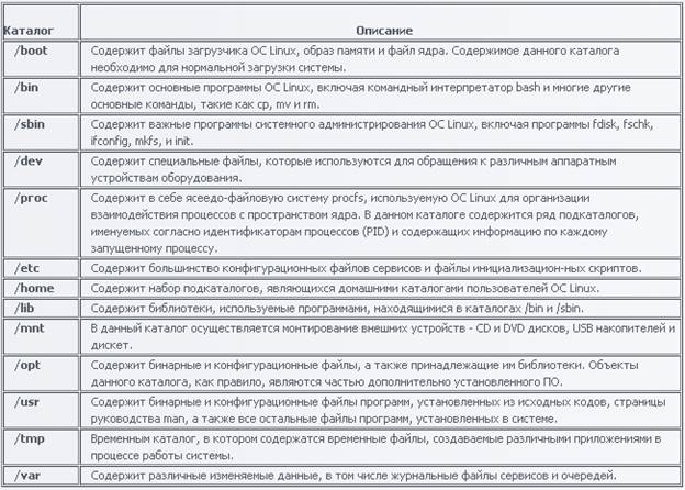 Иерархия каталогов файловой системы ОС Linux соответствует общепринятому в мире UNIX стандарту Filesystem Hierarchy System (FHS). Основное преимущество данного стандарта заключается в том, что определенные типы файлов расположены в соответствующих каталогах.