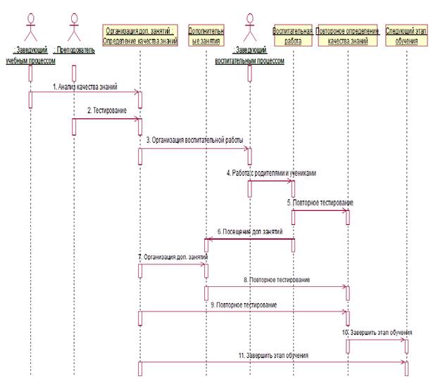 В этом разделе я раскрыл наиболее важный вариант использования «Определение качества знаний» и построил для нее диаграмму последовательности. Данная диаграмма отражает последовательность действий при проверке качества знаний, в случае неудовлетворительных результатов организуются дополнительные занятия и воспитательная работа для повышения качества.