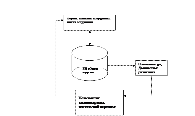 На рисунке ниже показана структура информационной системы. Входными документами являются заявление и анкета сотрудника. Эти данные хранятся в БД «Отдел кадров». Выходными данными являются полученные данные о сотруднике и должностные расписания. Данной БД пользуются администрация для просмотра данных и их подтверждения, технический персонал в лице сотрудника из отдела кадров для внесения входных данных в БД и последующей их корректировки.