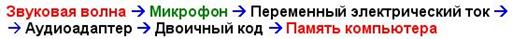 Процесс преобразования звуковых волн в двоичный код в памяти компьютера: