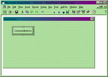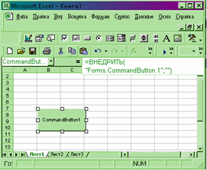 Для удобства работы с элементами управления в период их конструирования в Excel введен режим конструктора, который активизируется нажатием кнопки Режим конструктора (Design Mode) панели инструментов Элементы управления (Control Toolbox). В режиме конструктора отключена реакция элемента управления на события. Поэтому при включенном режиме конструктора можно видоизменять элемент управления и задавать его свойства. На рис. 2.3 показано создание элемента управления CommandButton (кнопка) на рабочем листе. После того как пользователь решит, что созданный элемент управления имеет тот вид, который ему нужен, и все требуемые свойства элемента управления установлены, он должен отключить режим конструктора повторным нажатием кнопки Режим конструктора (Design Mode).