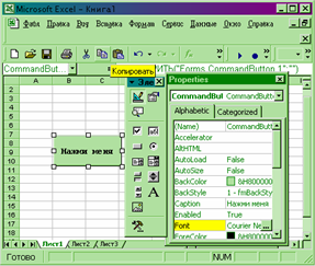 Для установки свойств элемента управления вручную при его конструировании необходимо выделить элемент управления и нажать кнопку Свойства(Properties) панели инструментов Элементы управления (Control Toolbox). На экране отобразится диалоговое окно Свойства (Properties)(рис. 2.4). Оно аналогично окну Свойства (Properties) редактора Visual Basic. Вручную при помощи этого окна обычно устанавливается свойство Caption, возвращающее отображаемый текст элемента управления. На рисунке 2.4 значение свойства Сaption элемента управления CommandButton изменено с установленного по умолчанию (CornmandButton1) на текст Нажми меня. Кроме того, внесены изменения в параметры свойства Font, устанавливающее шрифт выводимого на поверхности кнопки текста, а именно, увеличен размер шрифта с 8 до 12, шрифт MS Sans Serif заменен на Courier New и изменено начертание букв с обычного на полужирное. Также свойство Shadow установлено равным True, вместо False, как это имеет место по умолчанию. Свойство Shadow устанавливает, отображается ли элемент управления с тенью или без нее.