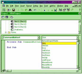 После установки свойств элемента управления или формы переходят к написанию кода, связанного с ними. Особое место в этом коде занимают процедуры обработки событий. У каждого элемента управления есть целый набор событий, обрабатывающих те или иные действия. Приведем некоторые из них: