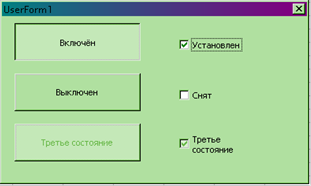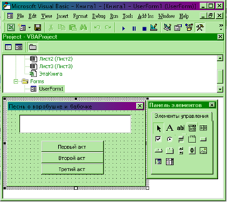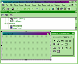 VВА обладает встроенным набором элементов управления. Используя этот набор и редактор форм не трудно создать любой пользовательский интерфейс, который будет удовлетворять всем требованиям, предъявляемым к интерфейсу в среде Windows. В данной главе дан обзор встроенных элементов управления VBA. Элементы управления являются объектами. Поэтому, как любые объекты, они обладают свойствами, методами и событиями. Элементы управления создаются при помощи панели инструментов Элементы управления (Control Toolbox). На этой панели представлены кнопки, позволяющие конструировать элементы управления, а также кнопки вызова окна свойств, перехода в режим конструктора и редактор кода.